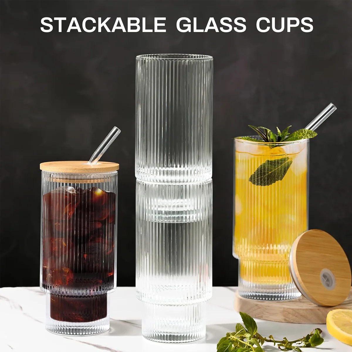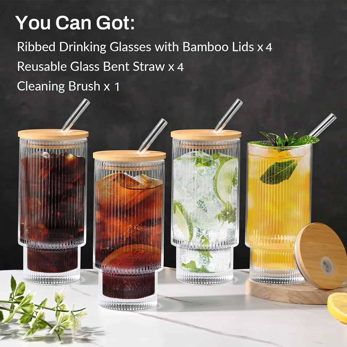 뚜껑과 빨대 세트가 포함된 리브드 유리 컵 4팩, 위스키 칵테일 맥주용 12OZ 빈티지 유리 제품, 뚜껑이 있는 아이스 커피 컵