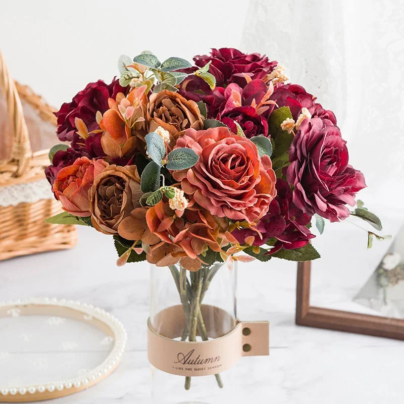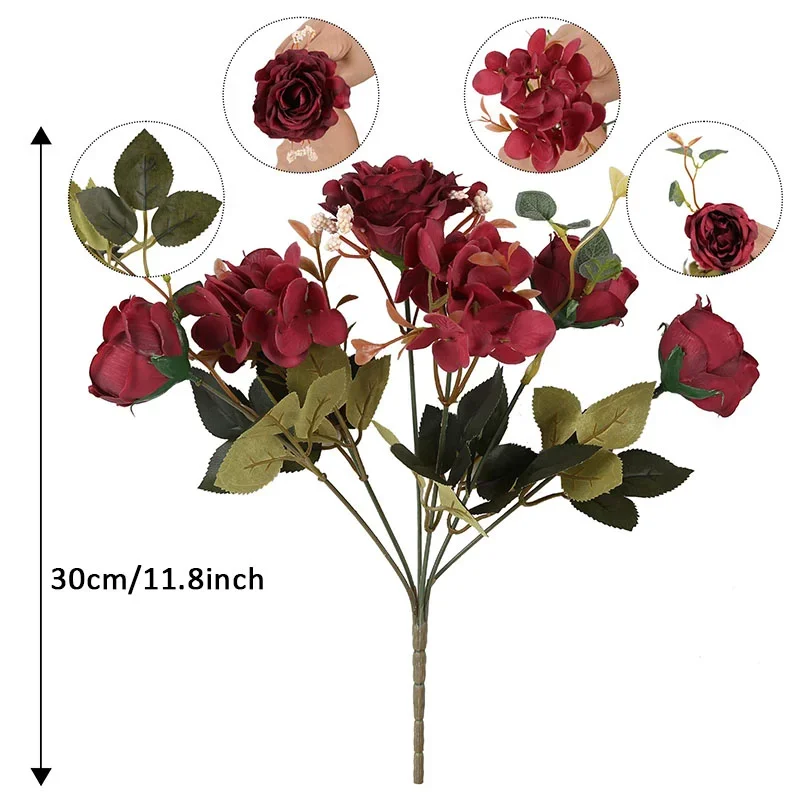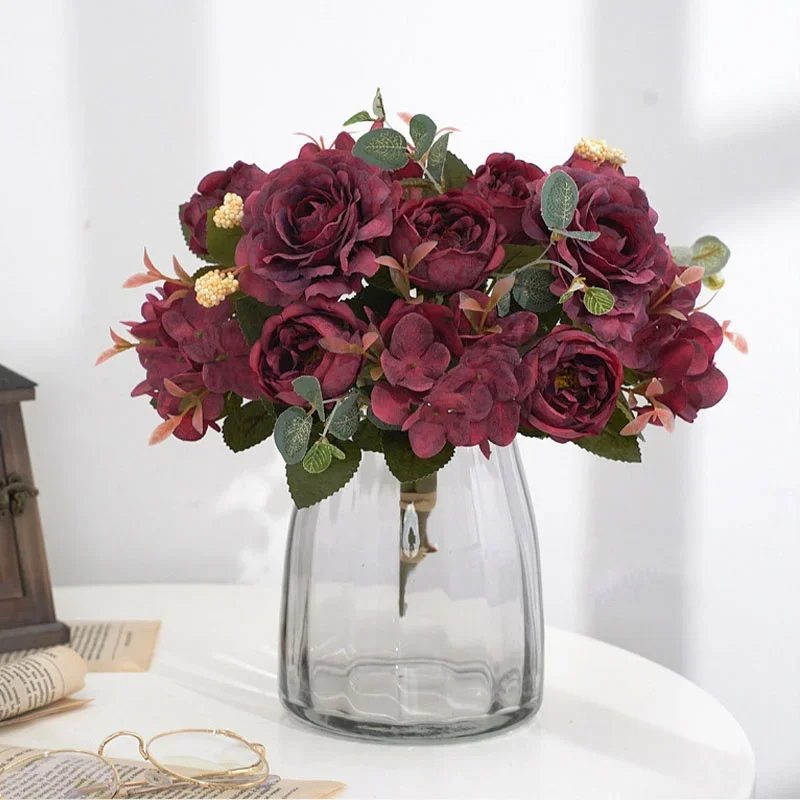 모란 인공 꽃 부르고뉴 실크 장미 꽃다발 수국 모란 빈티지 웨딩 신부 꽃다발 가짜 꽃 홈 인테리어