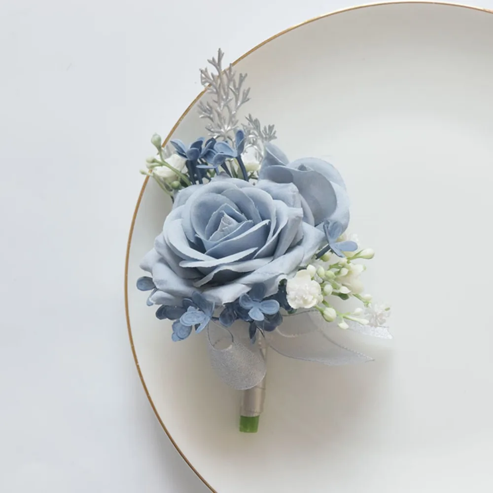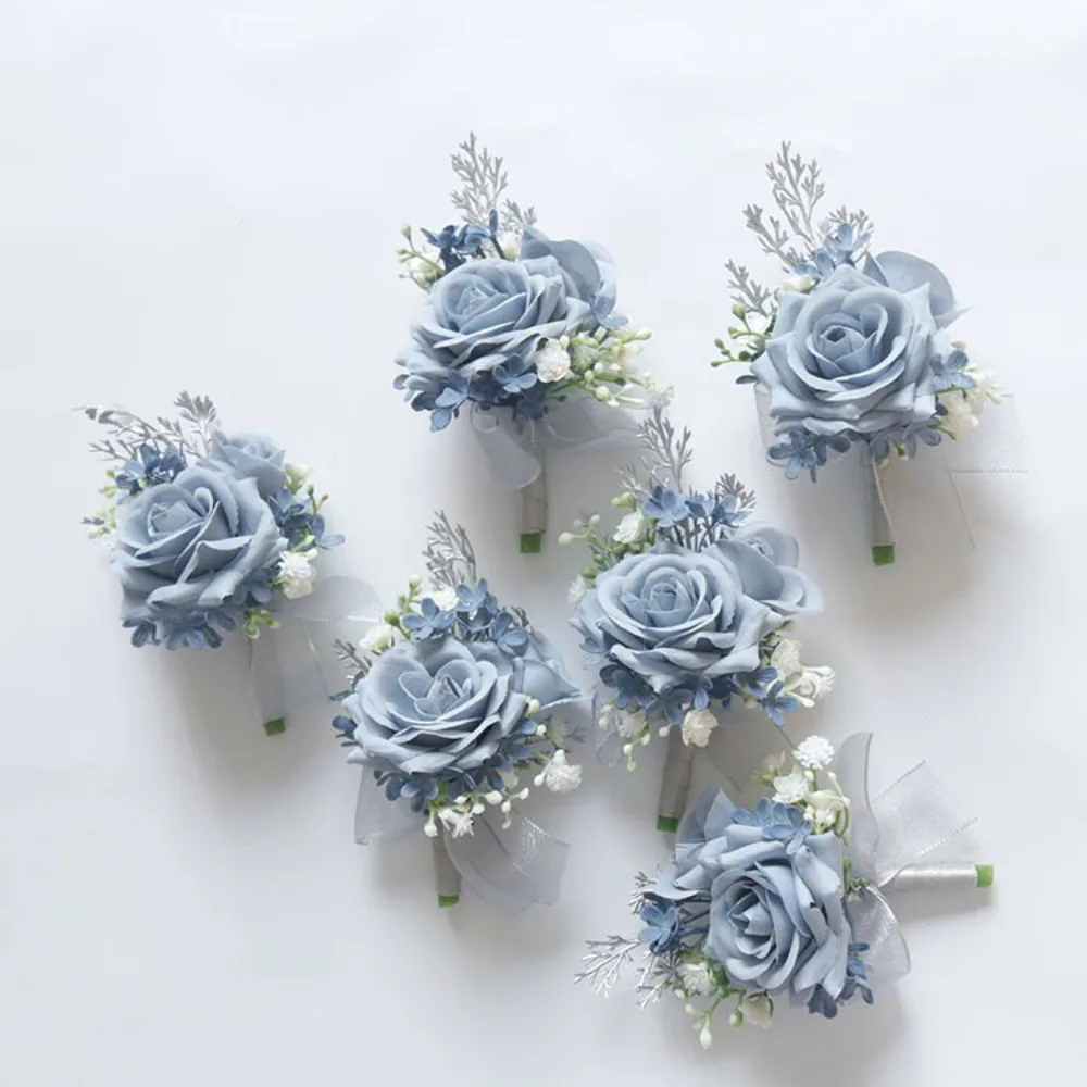 블루 웨딩 Ribbion 손목 코사지 Boutonnière Fleur Artificielle Mariage 남자 신랑 Fiori Da Polso