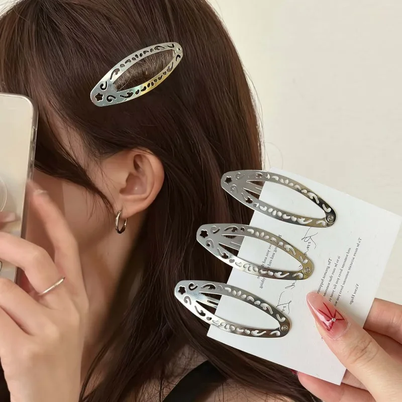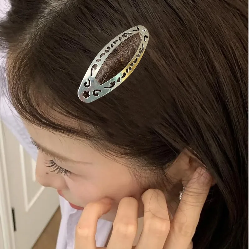 빈티지 할로우 아웃 패턴 헤어 클립, Y2K 기하학적 실버 타원형 스냅 헤어클립, 펑크 메탈 사이드 머리핀, 한국 헤어 액세서리