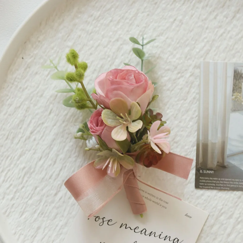 웨딩 인공 꽃 실크 로즈 Boutonniere Ribbion 손목 코사지 Botonier Para Novio Boda