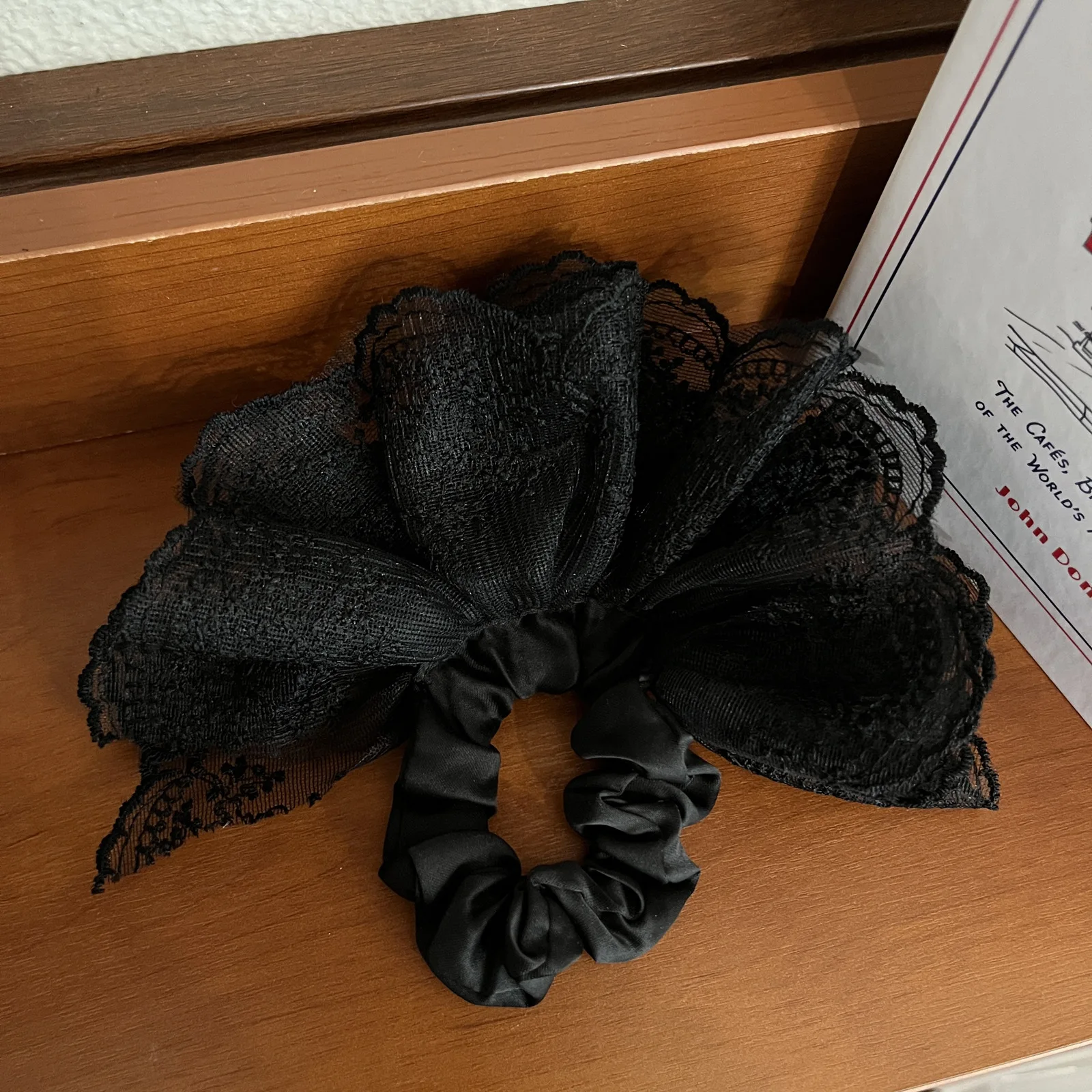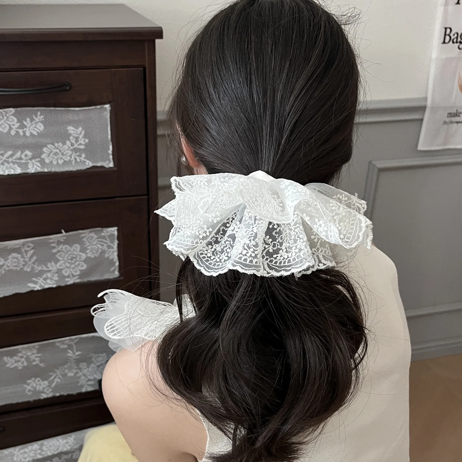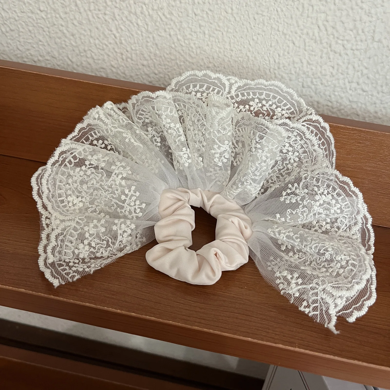 한국 감성 더블 레이어 자수 스커트 레이스 대장 스크런치 헤어플라워, 발레 스타일 포니테일 헤어밴드 1개