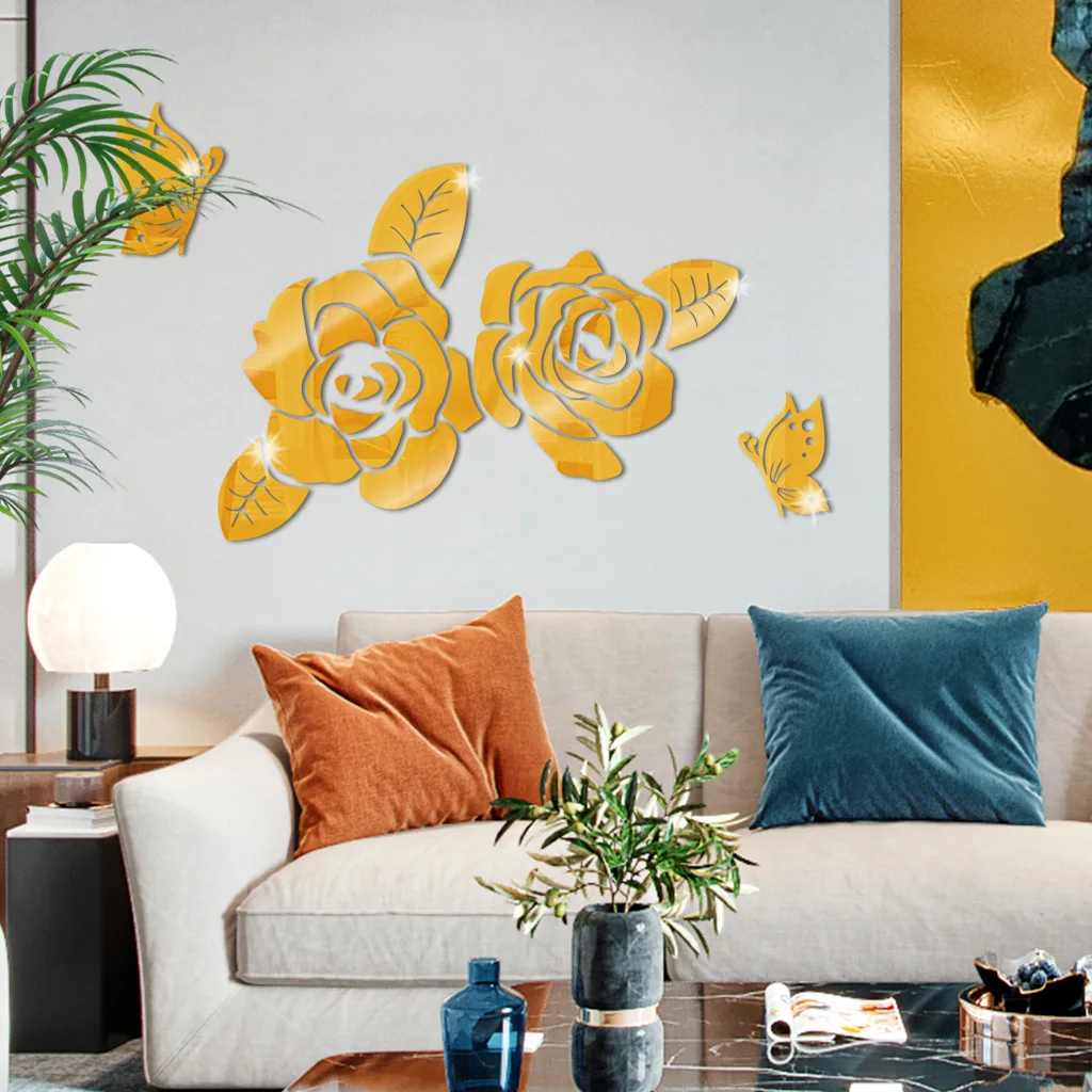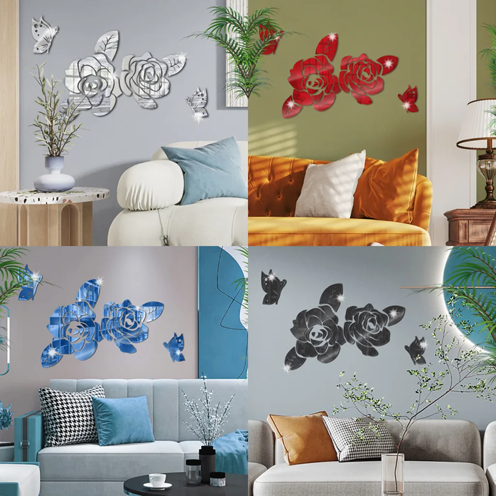나비 3D 로즈 미러 벽 스티커 자체 접착 아크릴 거울 사랑스러운 꽃 데칼 DIY 장식 이동식 장식 벽화