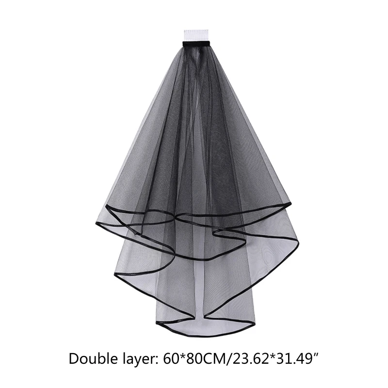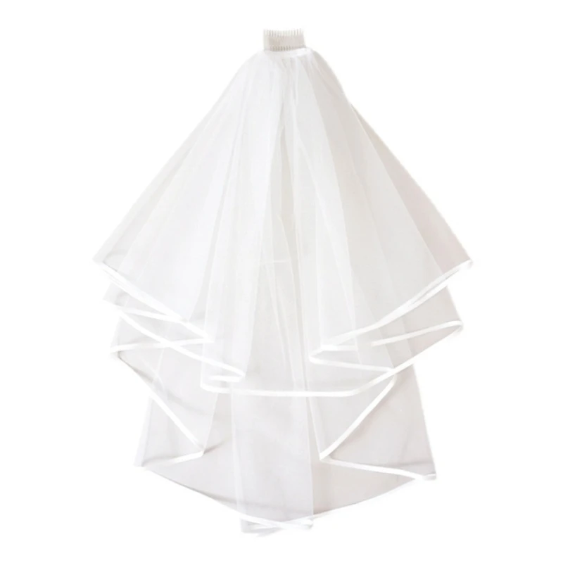 더블 레이어 메쉬 얇은 명주 그물 단색 여성 짧은 웨딩 베일 빗 리본 가장자리 센터 캐스케이드 신부 파티 헤드 피스
