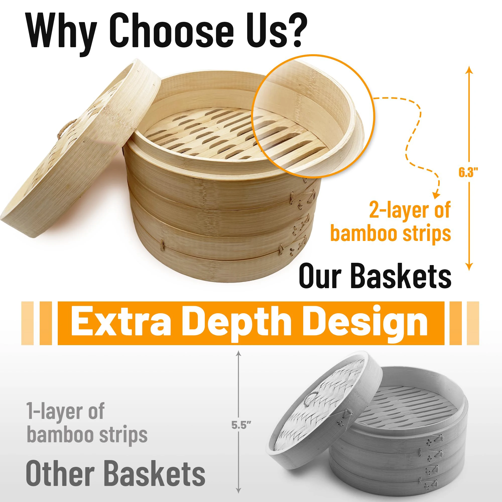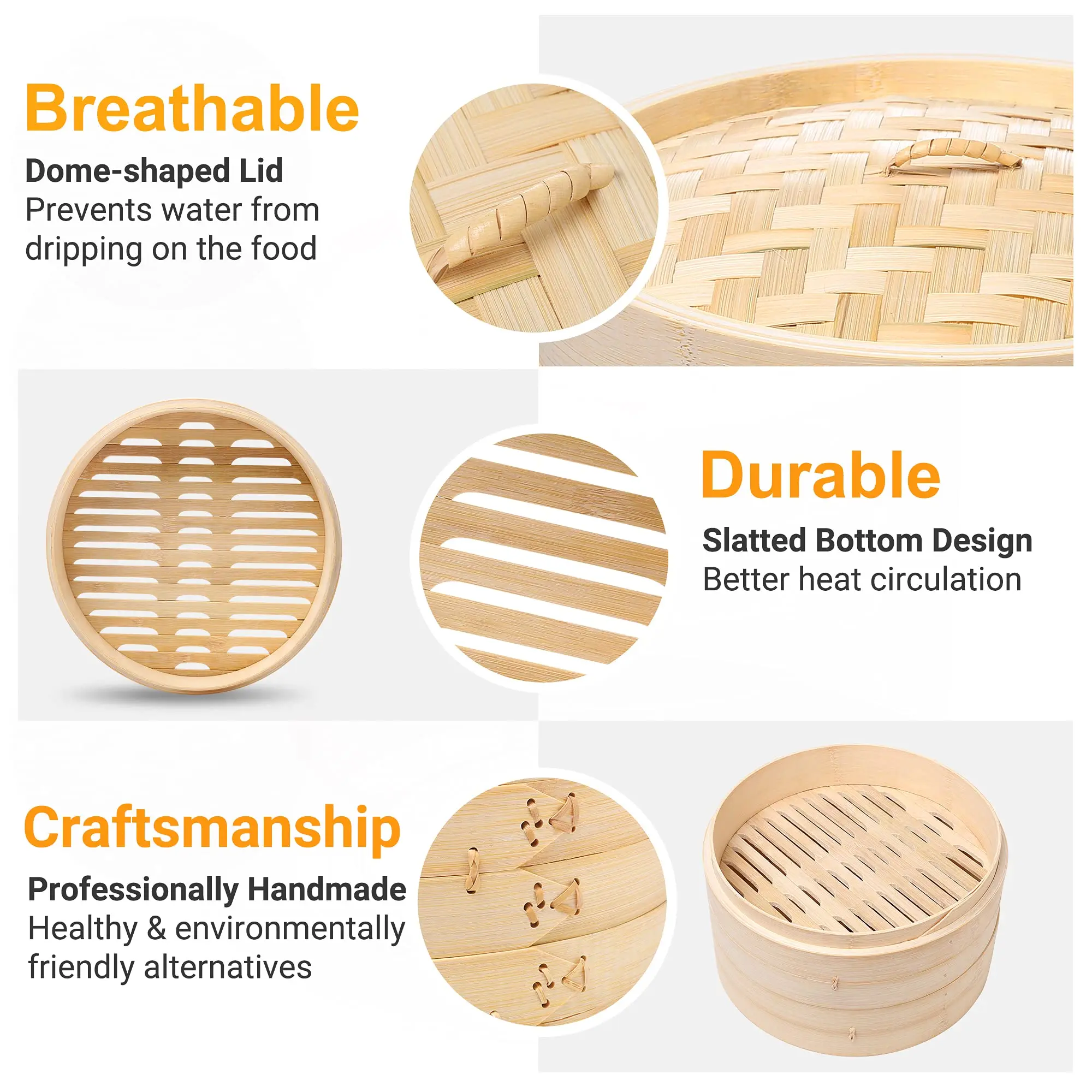 - 2: Large 3 tier steamer with handmade bamboo lid with stackable layers and slatted bases. 3-tier baskets can cook or reheat more portions at the same time.