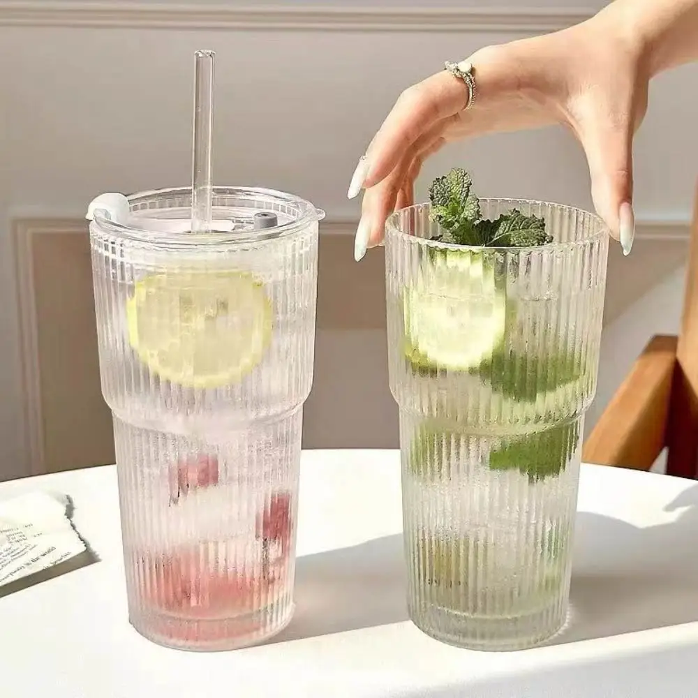 뚜껑이 있는 마시는 컵은 높은 붕규산 유리, 600ml 투명 유리, 유리 뚜껑, 유리 빨대, 골이 있는 유리 제품으로 만들어졌습니다.