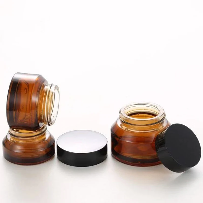 여행용 유리 앰버 페이셜 크림 항아리 빈 화장품 샘플 용기, 에멀젼 리필 가능 냄비, 블랙 뚜껑, 로트 당 10 개, 15g, 30g, 50g