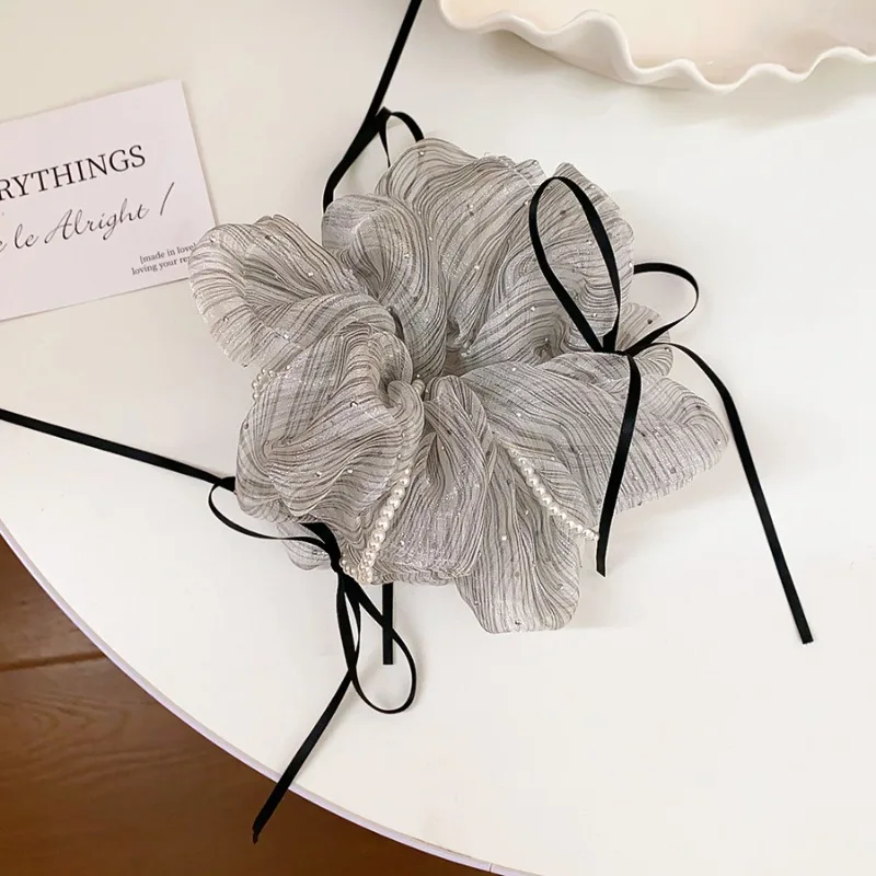 패브릭 메쉬 보우 반짝이 Scrunchies 여성용 라이트 럭셔리 모조 진주 보우 헤어 밴드 기질 리본 헤드 로프 액세서리
