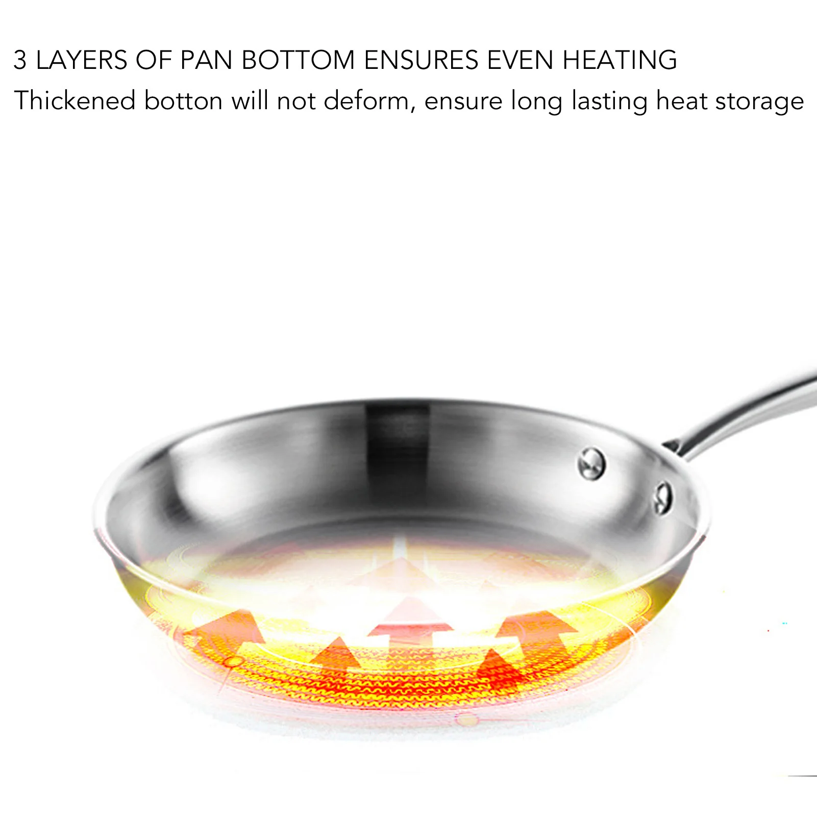 3.3겹: 이 스테인리스 스틸 프라이팬은 바닥이 3겹으로 되어 있어 빠르고 균일하게 가열되며 전문적인 열 분포가 가능합니다.