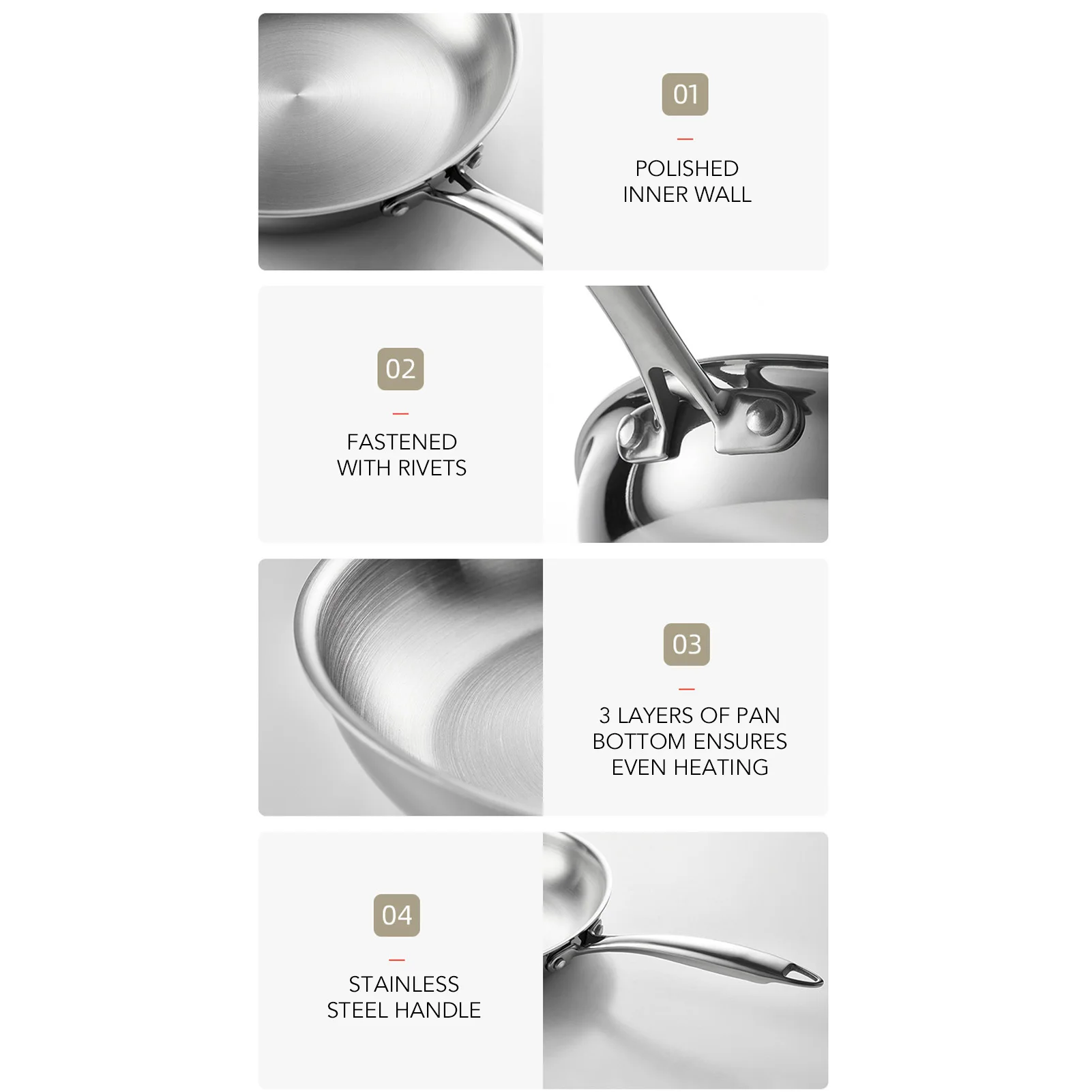 2.견고한 구조: 이 스테인레스 스틸 프라이팬은 리벳으로 고정되어 긴 수명이 보장됩니다.