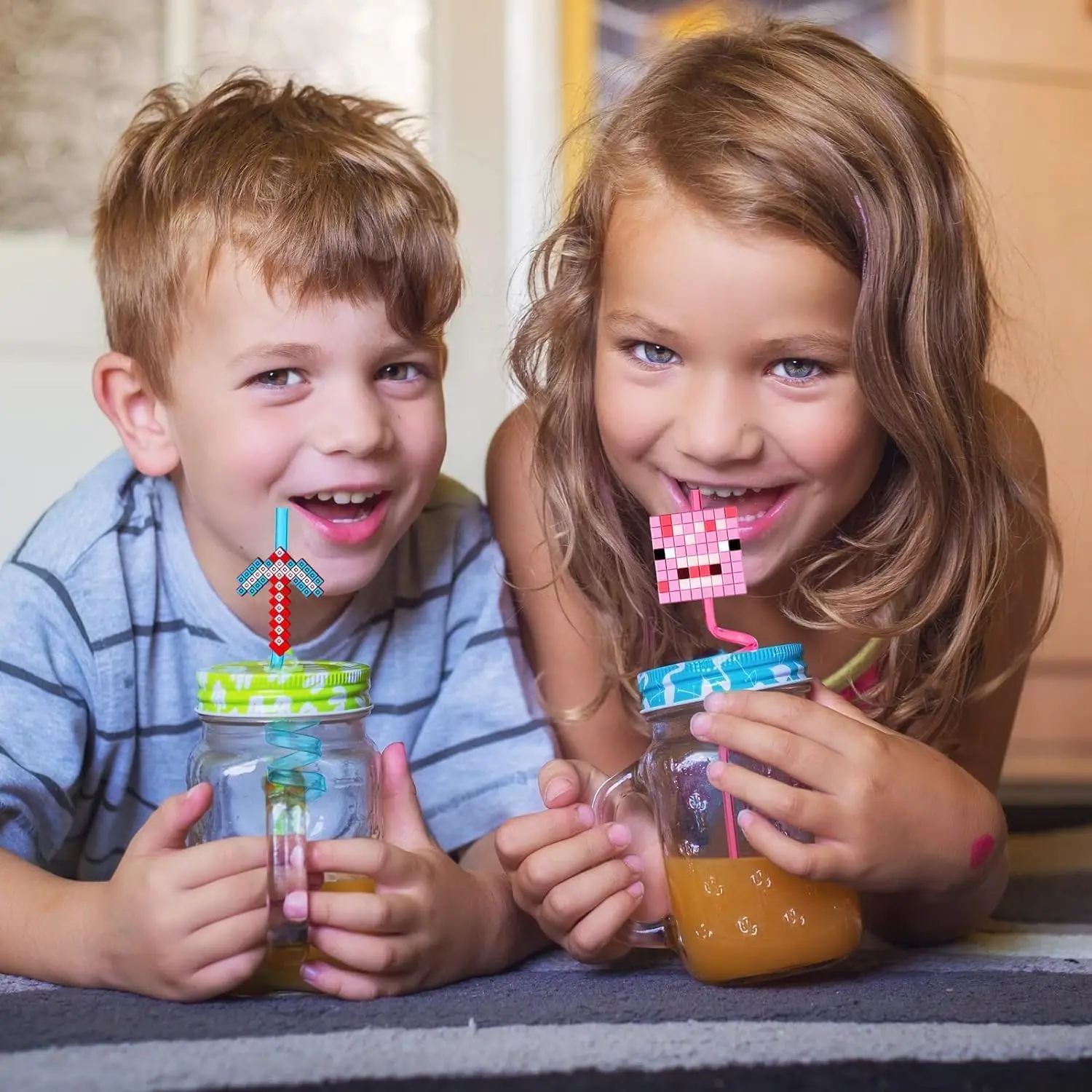 8/16PCS 광부 공예 생일 파티 용품 재사용 가능한 마시는 빨대 8 디자인 세계 픽셀 테마 파티 어린이는 주스 빨대를 선호합니다